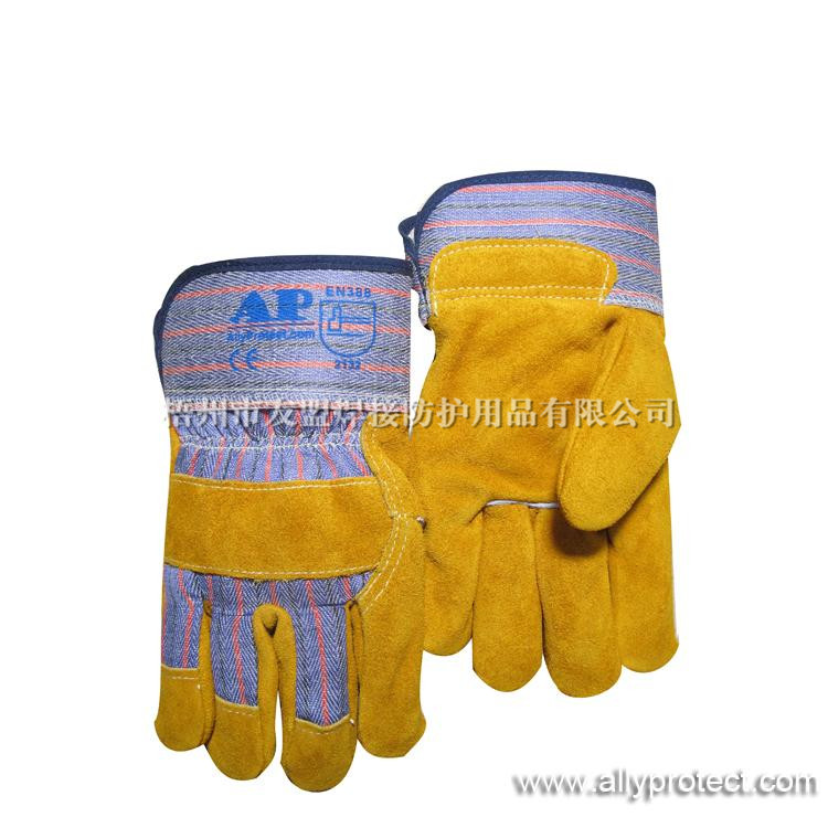 該款手套掌位部分采用耐磨、抗穿插的金黃色牛二層皮制成,質地厚實且柔軟舒適,抗穿插及內磨程度均勻;